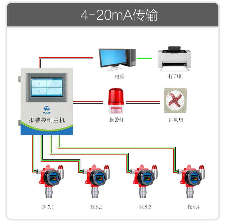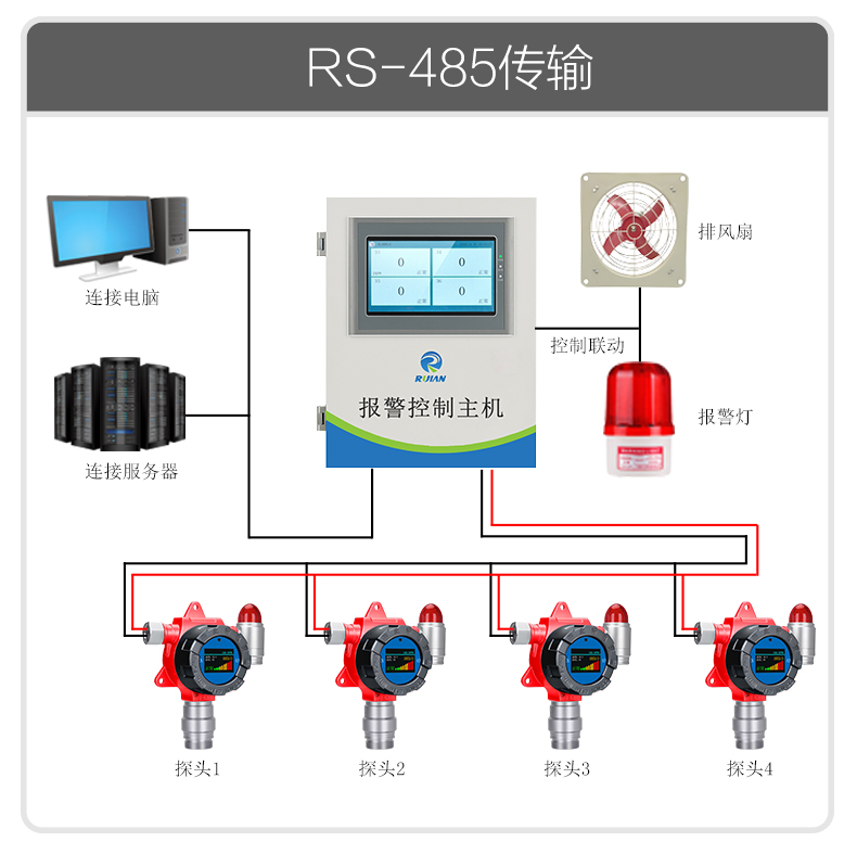 支持两级 / 三级报警阈值自定义,现场声光报警,同步输出 4~20mA、RS485(ModBus-RTU)及无源继电器信号,可联动风机、电磁阀、新风系统等设备,实现自动处置。